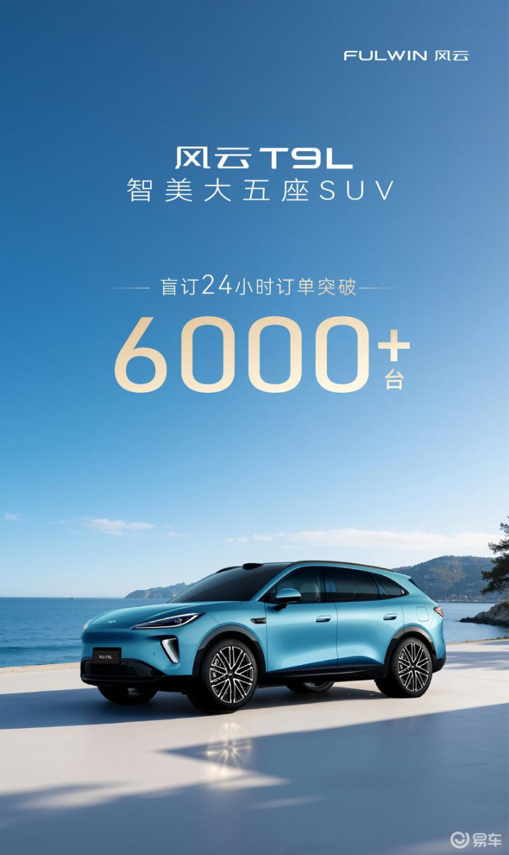 易车讯风云新能源日前宣布,奇瑞风云T9L开启盲订24小时订单突破6000+。风云T9L于1月17日开启盲订,999元下订可获赠四重礼遇,包含先享礼、野趣礼、铁粉礼和无忧礼。新车定位为大五座SUV,配备猎鹰700+智能辅助驾驶系统、地平线征程6P芯片等。据悉,风云T9L将在春节后正式上市。