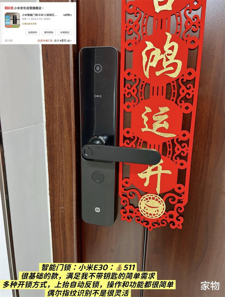终末就是小米E30智能门锁啦,相同唯有小几百块,莫得花里胡梢的功能,只为了外出不带钥匙,可能因为其时录入的时间不到位,指纹偶然间不是很精准(但我家那位用就没事儿),归正也不难用。