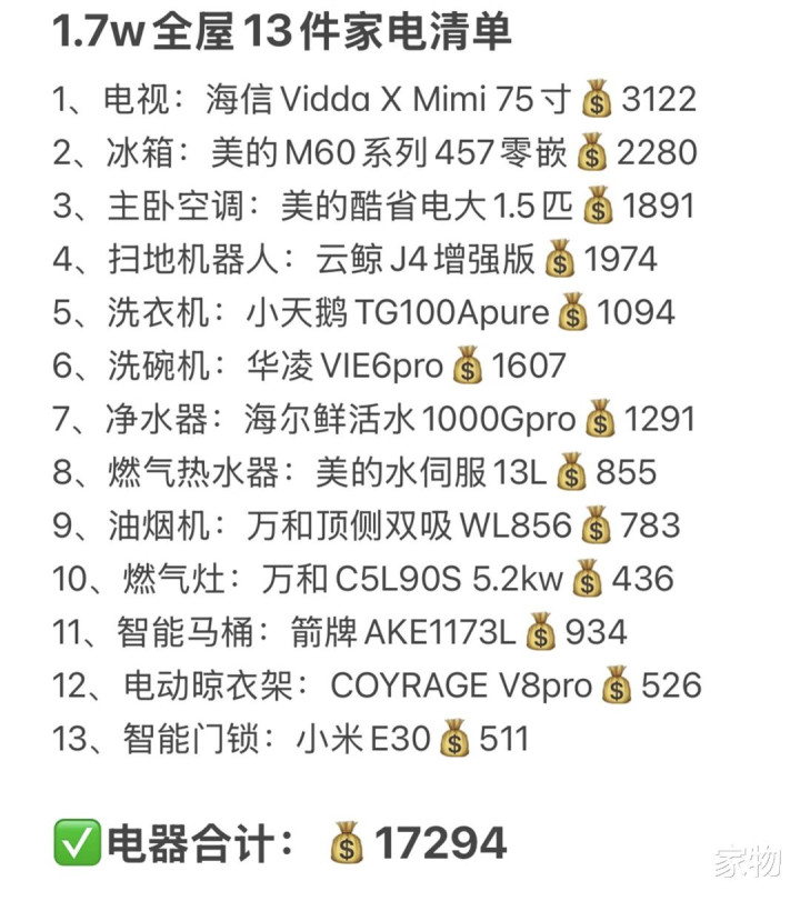 以上即是我家1W7买的13件全屋家电啦,如果再加上两台空调的话,也不外2W多少许,个东谈主嗅觉还是挺合算的,把清单共享给各人,需要的话自取哦~