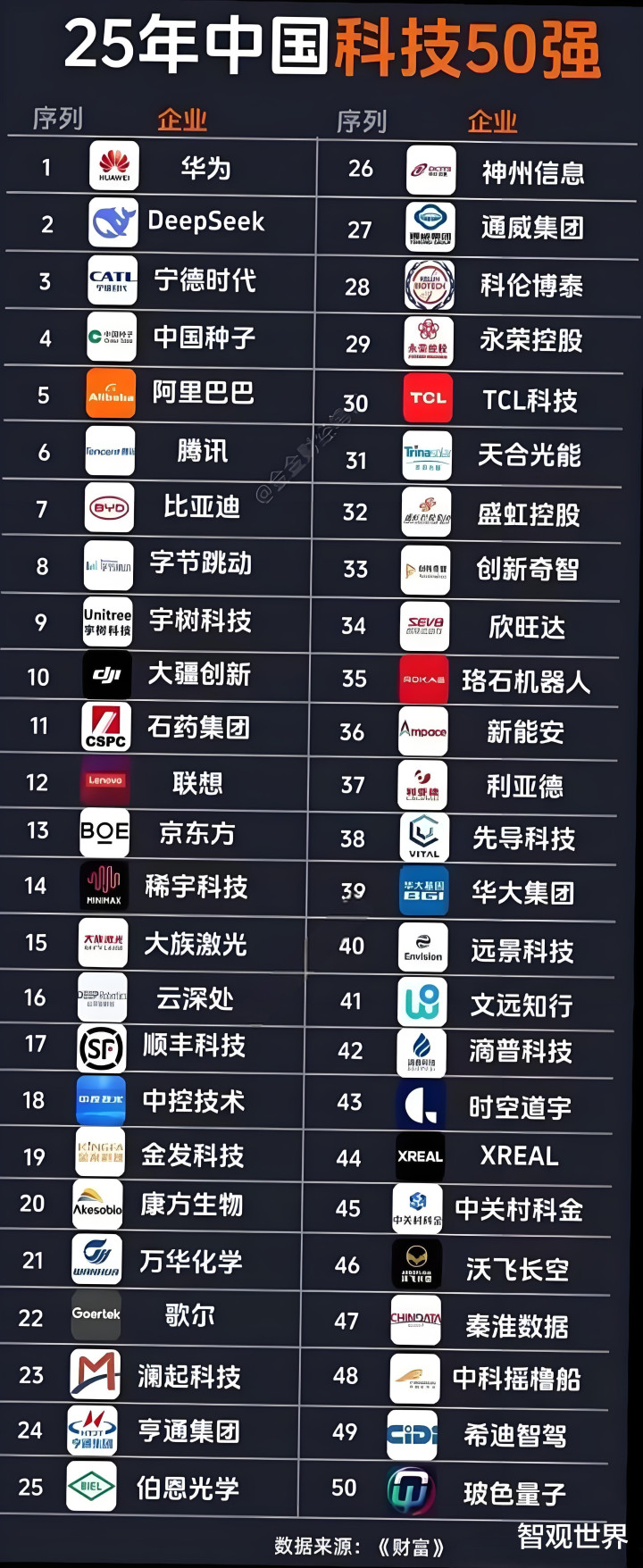 美国顶级商业期刊《财富》杂志(隶属时代公司,和各国政要以登上封面为荣的《时代周刊》为姊妹杂志)发布了2025年“中国科技50强”榜单,商界媒体翘楚——《财富》榜单的分量可不轻,覆盖了从人工智能、生命健康到新能源、高端制造的多个硬核赛道,堪称一份观察中国科技力量的“体检报告”。