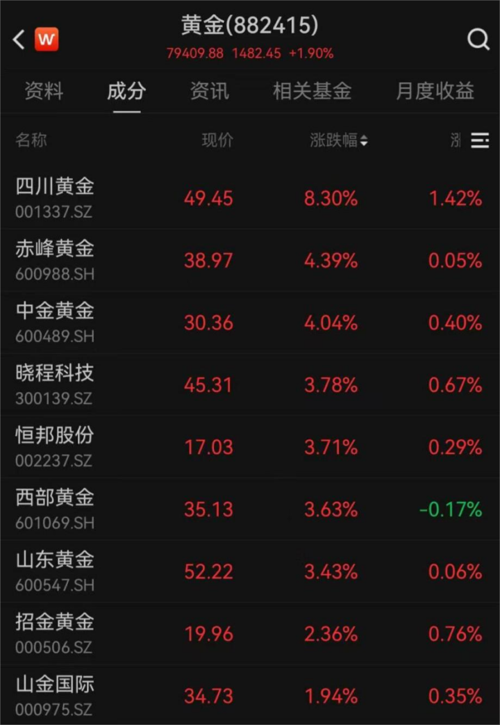 黄金股继续大涨,四川黄金涨超8%,赤峰黄金、中金黄金等涨超4%。