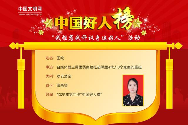 王皎,女,1988年1月生,陕西省渭南市富平县东华街道东新村村民,一位记录家庭温情的自媒体博主。前任丈夫意外离世后,王皎独自扛起照顾女儿和前夫家人的责任。组建新家庭后,她又承担起照顾现任家庭爷爷、公公和婆婆的重担。她用短视频记录着一个重组家庭的温暖日常,开云用柔弱的肩膀扛起照顾四代人、三个家庭的重担,用十年如一日的坚守诠释着“孝老爱亲”的真谛。截至2025年11月,她的个人账号累计收获近80万网友关注、2700万次点赞。王皎曾获“陕西好人”等荣誉。
