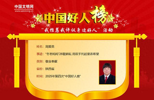 周爱英,女,1975年4月生,陕西省大荔县红枣产业发展中心副主任,省、市、县三级科技特派员。26年来,她始终扎根冬枣产业一线,潜心钻研栽培技术,以科技力量助推大荔冬枣从地方特产成长为闻名全国的百亿级主导产业,被广大枣农深情称为“冬枣妈妈”。周爱英曾获“陕西省道德模范”“陕西省先进工作者”“陕西省三八红旗手”“陕西省林业先进工作者”等荣誉。