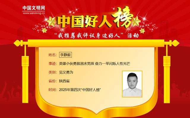 李静毅,男,1991年3月生,生前系陕西省商洛市商州区金陵寺镇崔坪村村民。2025年7月25日晚,李静毅携家人在西安市高陵区泾渭街道渭河河堤路游玩,忽然听到有人坠河呼救,李静毅立即下河施救,与岸上群众共同努力,成功将落水儿童救起,但李静毅却被河水冲走,献出了自己年轻的生命。李静毅先后被追授为“全国见义勇为勇士”“陕西省道德模范”“陕西好人”,并被评定为烈士。(此前报道:从平凡焊工到救人英雄,有一种勇敢叫李静毅!)