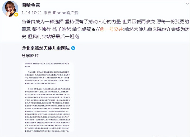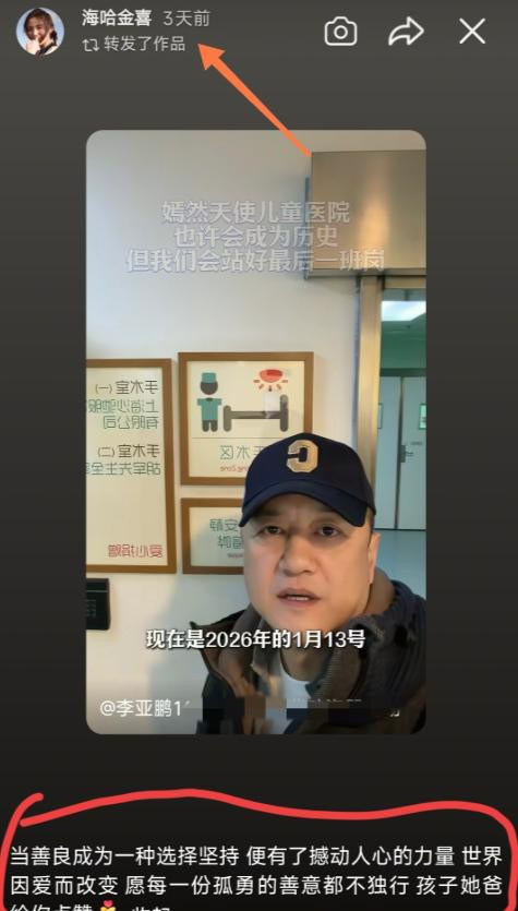 她转发了李亚鹏前一天关于嫣然天使儿童医院的求助声明,配文写得特别真诚:“当善良成为一种选择,坚持便有了撼动人心的力量。