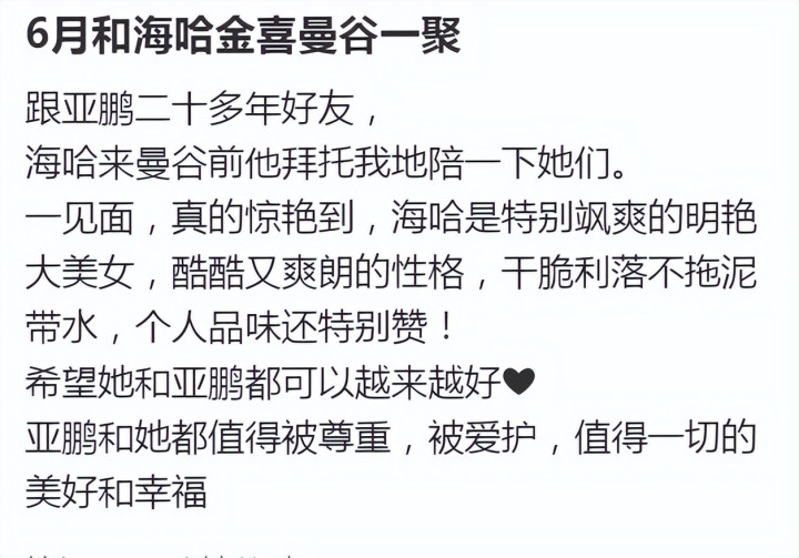 亚鹏也在采访中提到:“海哈是个好女人,是我对不起她。”