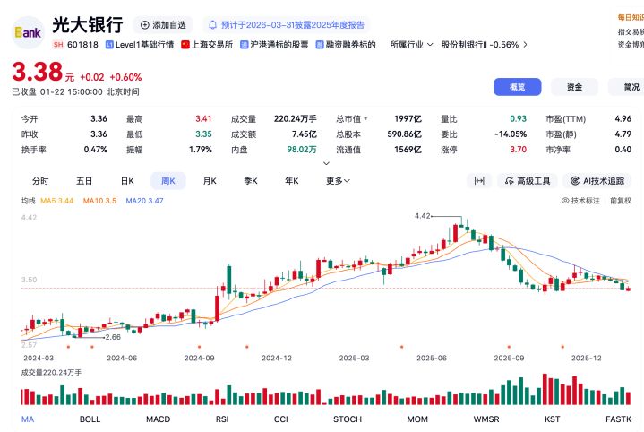 资本市场的反馈更为直接,2026年初光大银行股价呈现持续低迷态势,波动细节进一步印证了市场信心的缺失。从市场表现看,光大银行股价自2025年末以来持续承压。以A股为例,其股价于2025年12月22日收报3.52元,当日成交额6.52亿元,股价已接近3.50元附近的年内关键支撑区域。进入2026年1月,股价震荡下行,截至1月19日最低跌至3.33元,较2025年底累计下跌约4.6%。与此同时,市场交投持续清淡,且公开数据显示其近期主力资金呈净流出状态,反映出市场信心不足。估值层面,该行长期处于行业谷底,截至1月22日,其A股市净率(PB)仅约0.33倍,市盈率(TTM)约4.93倍;H股估值则更低。摩根士丹利在近期报告中指出,其预测光大银行H股2026年目标市净率仅为0.31倍,显著低于同业平均水平。某券商银行业首席分析师表示,“投资者对光大银行的信心缺失,本质是对其业务修复能力和风险控制能力的不信任,叠加公司治理架构调整的不确定性,估值折价难以快速收窄。”