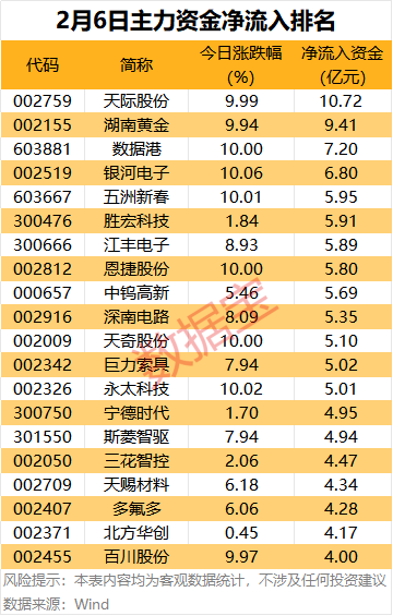从个股看,40股主力资金净流入超2亿元,天际股份、湖南黄金、数据港、银河电子、五洲新春(维权)等13股获主力资金净流入超5亿元。