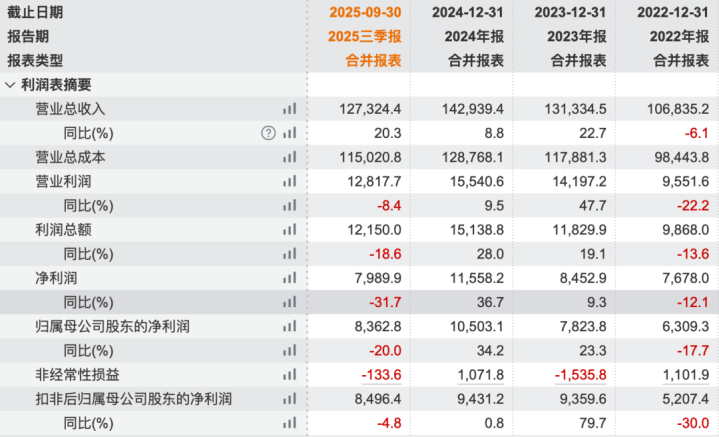 这种重资产、长周期的模式,直接体现在了三博脑科2025年的业绩上。2025年前三季度,三博脑科营业总收入为12.73亿元,同比增长约20%,但归母净利润却同比下降20.01%,仅为8362.82万元。