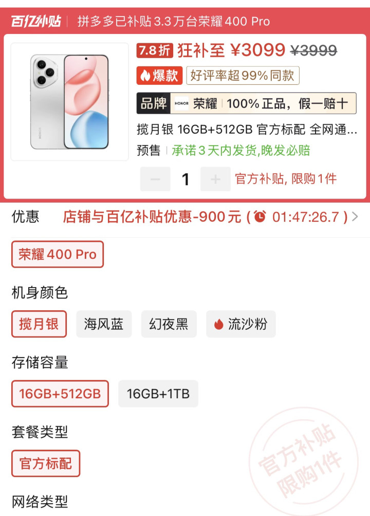 总的来说,就荣耀400 Pro并不是一台靠某一项配置“出圈”的手机,而是那种把屏幕、性能、续航、影像、体验全部揉在一起,形成稳定、耐用、好用整体感的产品,它不会每天提醒你“我很强”,但会在你用久之后,让你慢慢意识到,这台手机,确实选得不亏!如果你想要的是一部能陪你安心用上几年、同时又能在生活中不断给你小惊喜的机型,就荣耀这款产品绝对是很值得入手的,而就在价格层面如今也是很亲民的存在了,参考到如今电商平台中的价格,16GB+512GB的内存规格已经是跌到了3099元了。