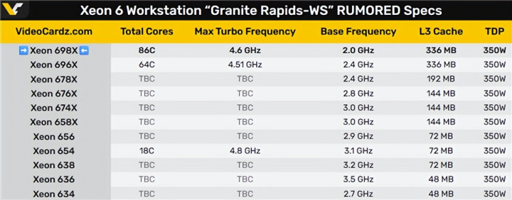 至强600系列代号Granite Rapids-WS(GNR-WS),源于数据中心的至强6 P核版本(代号Granite Rapids),按惯例降低了一些规格。