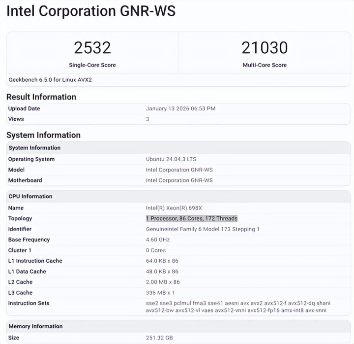 GeekBench里出现了旗舰型号至强698X,明确有86核心172线程、336MB三级缓存,主频最高4.6GHz(基准2.0GHz),热设计功耗350W。