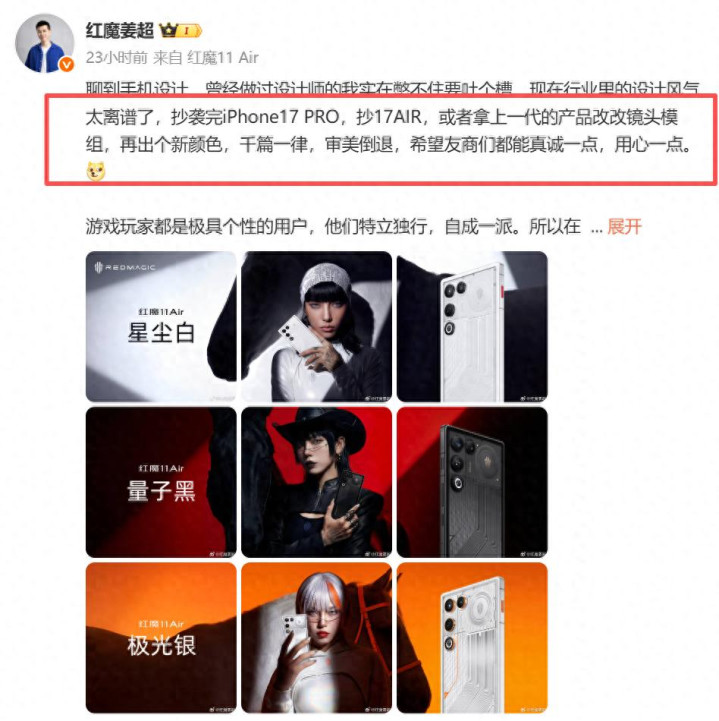 近日,红魔手机产品总经理姜超在微博吐槽手机行业设计风气,他表示抄袭完iPhone 17 Pro,抄17Air,或者拿上一代产品改改镜头模组、新配色现象一直存在,呼吁厂商用心一点、拒绝千篇一律的同质化设计。