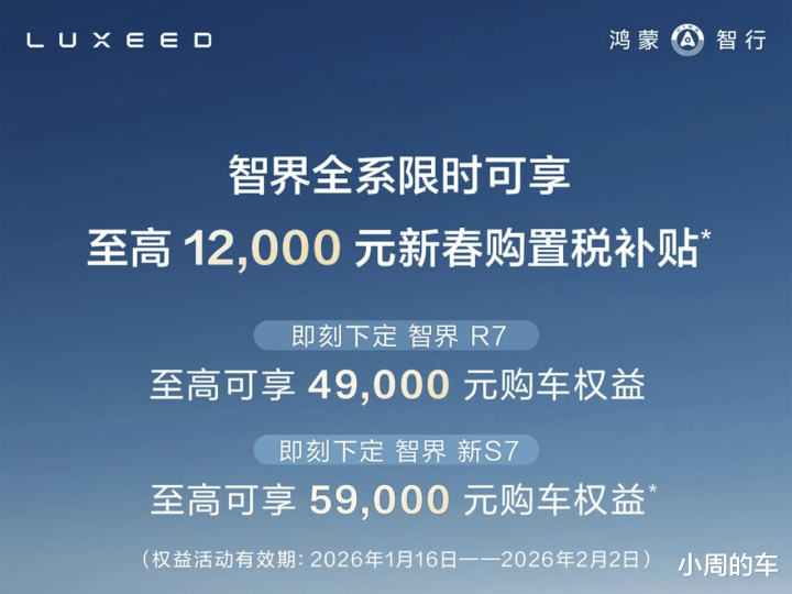 鸿蒙智行旗下的智界R7与智界S7全系车型可享受至高1.2万的购置税补贴,截止时间2月2日;